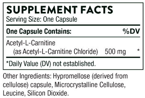 Thorne Acetyl-L-Carnitine is a dietary supplement providing 500 mg of acetyl-L-carnitine per capsule. Each bottle contains 60 vegetarian capsules, manufactured and tested for quality. Free from gluten, dairy, and soy.