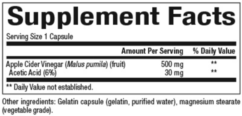 Each capsule delivers 500 mg of fermented apple cider vinegar made with “the mother.”