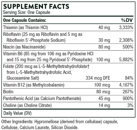 Thorne B-Complex #6 is a dietary supplement providing a blend of B vitamins, including B1 (thiamine), B2 (riboflavin), B3 (niacin), B5 (pantothenic acid), B6 (pyridoxine), B12 (methylcobalamin), and biotin. Each bottle contains 60 vegetarian capsules and is free from gluten, dairy, and soy.