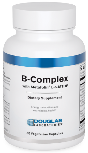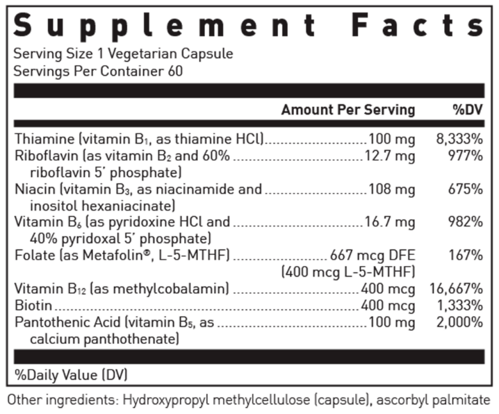 B-Complex with Metafolin is a dietary supplement provided in vegetarian capsules. Each bottle contains 60 capsules. The formula features activated forms of B vitamins including 5-MTHF (Metafolin®). The product is made under GMP quality standards and is free from gluten and dairy.
