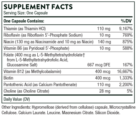 Thorne Basic B Complex is a dietary supplement in capsule form. Each bottle contains 60 capsules, each providing a blend of B vitamins and choline.