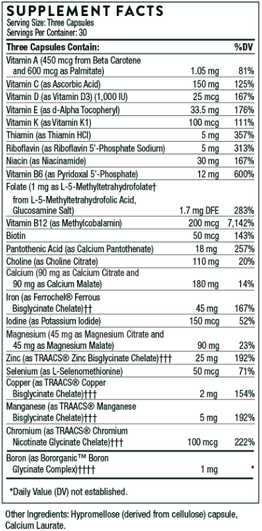 Thorne Basic Prenatal is a dietary supplement in capsule form. Each bottle contains 90 capsules, each providing a blend of vitamins and minerals.