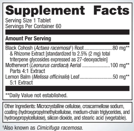 Includes black cohosh root & rhizome extract, motherwort aerial parts, and lemon balm leaf extract