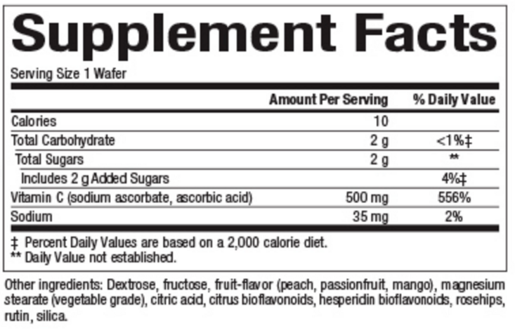 Delivers 500 mg of vitamin C per wafer from ascorbic acid and sodium ascorbate.