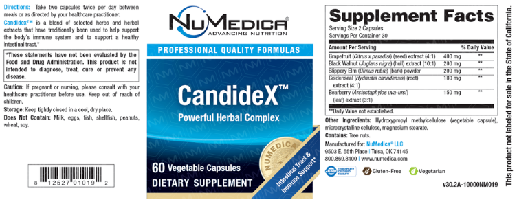 NuMedica CandideX™ is a clean-label, gut-friendly herbal formula composed of grapefruit seed, goldenseal, black walnut hull, and slippery elm bark extracts. Encapsulated in a 60-count vegetable capsule bottle, this product omits common allergens and artificial ingredients, and is manufactured in a GMP-certified facility in the USA.
