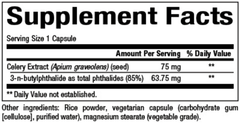 Typical serving contains 75 mg of celery seed extract (Apium graveolens seed) with about 63.75 mg of 3-n-butylphthalide.
