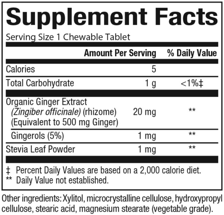 Chewable Ginger provides 500 mg of ginger equivalent per tablet in a naturally flavored chewable format designed to support digestion, soothe occasional nausea, and promote overall gastrointestinal comfort.