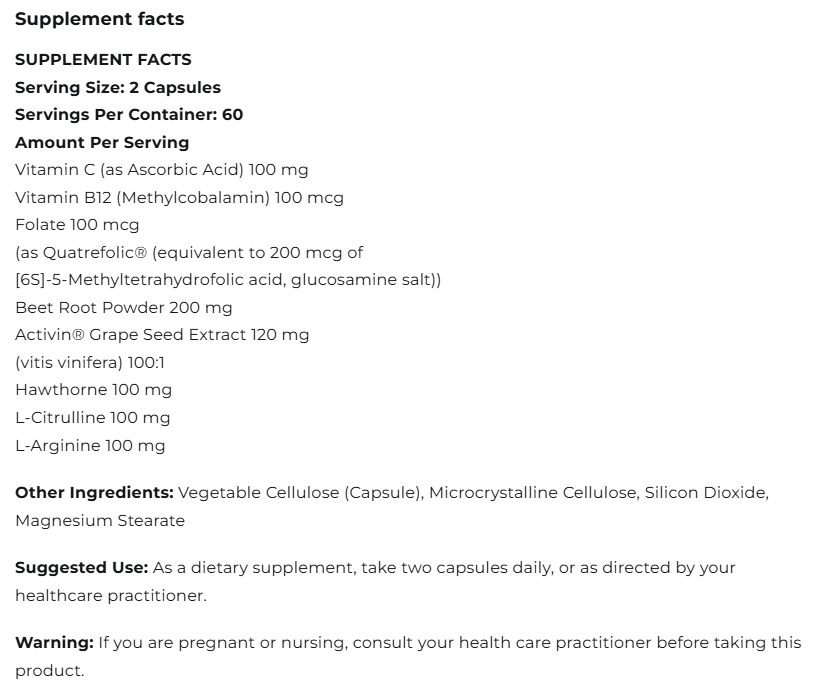 Combines botanical extracts and nutrients that align with circulatory and vascular wellness goals.