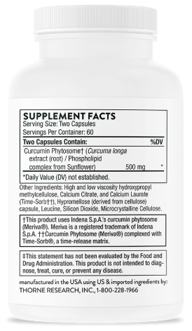 Thorne Meriva-SF is a dietary supplement in capsule form. Each bottle contains 120 capsules, each providing 500 mg of curcumin phytosome.