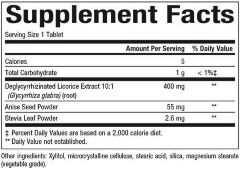 Contains 400 mg per tablet of a licorice root extract standardized to a 10:1 ratio, offering concentrated botanical support for the gastrointestinal system.