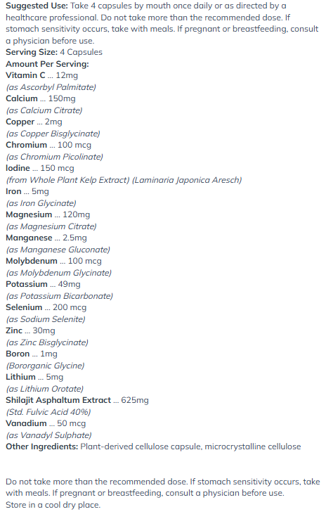 Dr. Shade’s Catalyzed Mineral Complex is a comprehensive blend of macro minerals and trace minerals to support a healthy mineral status and the many processes of detoxification. Unique to this foundational mineral complex is the organic Himalayan resin Shilajit, rich in fulvic acid to help transport minerals to cells, and Laminaria, a brown seaweed rich in iodine and other bioactive compounds aiding metabolic optimization.