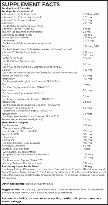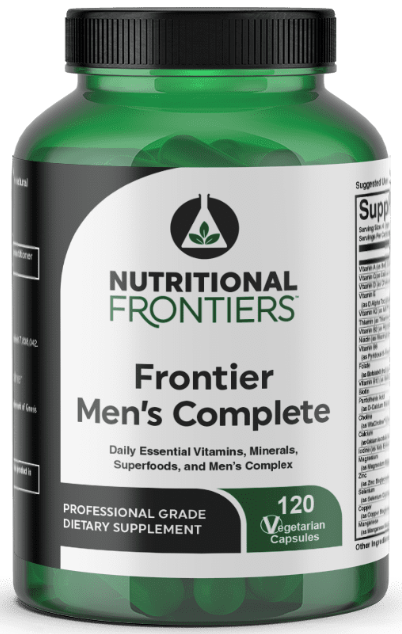 Frontier Men’s Complete by Nutritional Frontiers is a high-quality multivitamin-mineral designed for men. The easy-to-swallow vegetarian capsules provide vitamins, minerals, antioxidants, and other nutrients in bioavailable forms and nutritionally meaningful amounts. Frontier Men’s Complete provides important antioxidant vitamins A, C and E, an array of B vitamins, easily absorbable calcium and magnesium, as well as a full spectrum of bioavailable, trademarked TRAACS® minerals and trace elements. Frontier Men’s Complete also contains beneficial additions like choline, CoQ10, Lutemax, lycopene, red beet powder, DMG, saw palmetto, and a super-food blend.