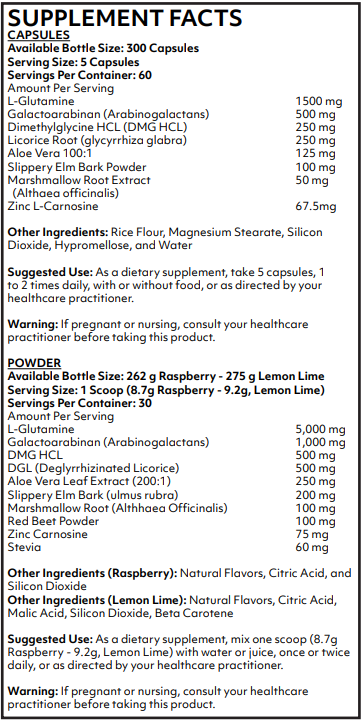 G.I. Complete is available in capsules or a convenient, crystalline powder which mixes easily into any beverage or other functional food powder and is free of any ingredient that causes gas and or bloating.