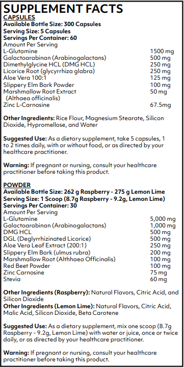 GI Complete is available in capsules or a convenient, crystalline powder which mixes easily into any beverage or other functional food powder and is free of any ingredient that causes gas and or bloating.