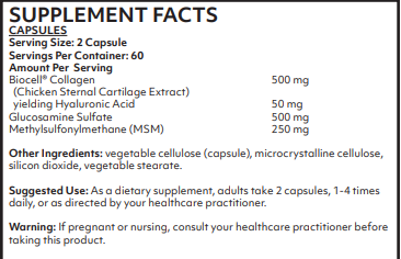 BioCell Type II Collagen Matrix consists of Collagen, Hyaluronic acid in a patented delivery system utilizing a low molecular weight H.A. (less than 30,000 daltons) for optimal utilization by the body and chondroitin sulfate. 60 mg of H.A. per serving.