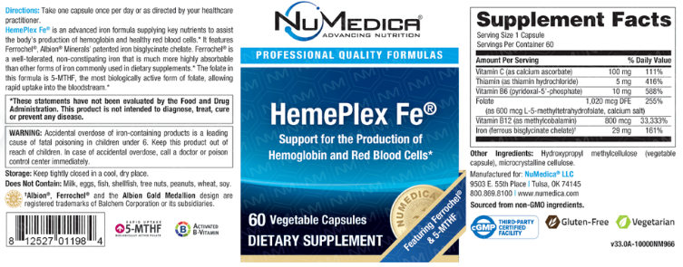 NuMedica HemePlex Fe® is a thoughtfully formulated supplement featuring iron bisglycinate chelate for better tolerance, paired with activated folate (5‑MTHF) and essential B‑vitamins. Designed for general wellness routines, this clean-label blend is gluten-free, vegetarian, and produced in a GMP-certified U.S. facility.