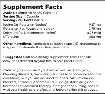 Iodine Plus is a vegetarian synergistic blend of two types of Iodine plus L-Tyrosine and Selenium to support the maintenance and proper function of a healthy thyroid.