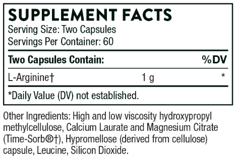 Thorne L-Arginine – Sustained Release is a dietary supplement providing L-arginine in vegetarian capsules. Each bottle contains 90 capsules. The formula is free from gluten, dairy, and soy.