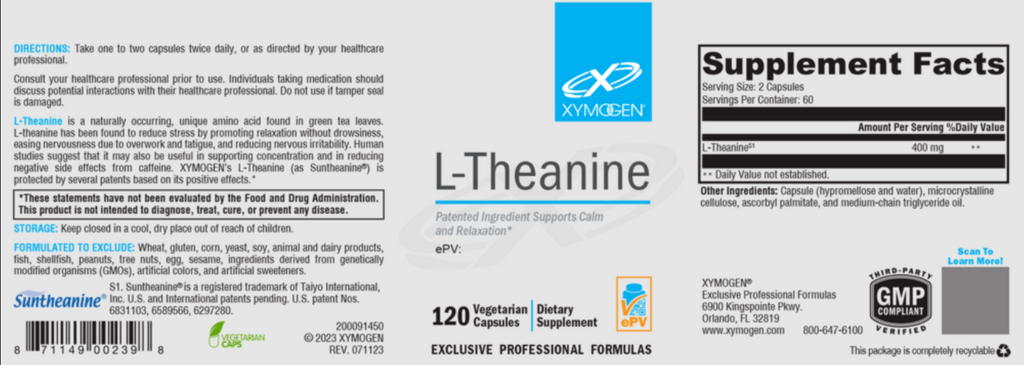 L-Theanine is a naturally occurring, unique amino acid found in green tea leaves. L-theanine has been found to reduce stress by promoting relaxation without drowsiness, easing nervousness due to overwork and fatigue, and reducing nervous irritability. Human studies suggest that it may also be useful in supporting concentration and in reducing negative side effects from caffeine. XYMOGEN’s L-Theanine (as Suntheanine®) is protected by several patents based on its positive effects.*