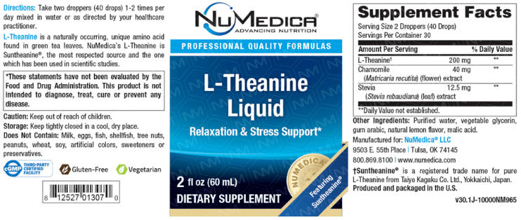 NuMedica L-Theanine Liquid features Suntheanine®—a premium, pure form of L-theanine—presented in an efficient liquid delivery system. This product is crafted without gluten, soy, dairy, or artificial additives, and is suitable for vegan and non-GMO dietary preferences. Produced in a GMP-certified facility to ensure consistent quality and purity.