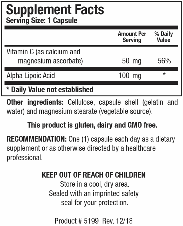 Lipoic Acid Plus supplies alpha-lipoic acid (ALA), a potent antioxidant and a critical cofactor for many enzyme complexes, along with vitamin C. As a powerful biological antioxidant, lipoic acid’s capability to quench free radicals is equivalent to that of coenzyme Q10 (CoQ10), and vitamins C and E. In the body it functions as both a coenzyme, and a necessary component for normal mitochondrial function. ALA is unique in that it has activity in both fat and water-soluble tissues. ALA has demonstrated advantageous effects in supporting the cardiovascular system, biological energy production and glucose regulation.*