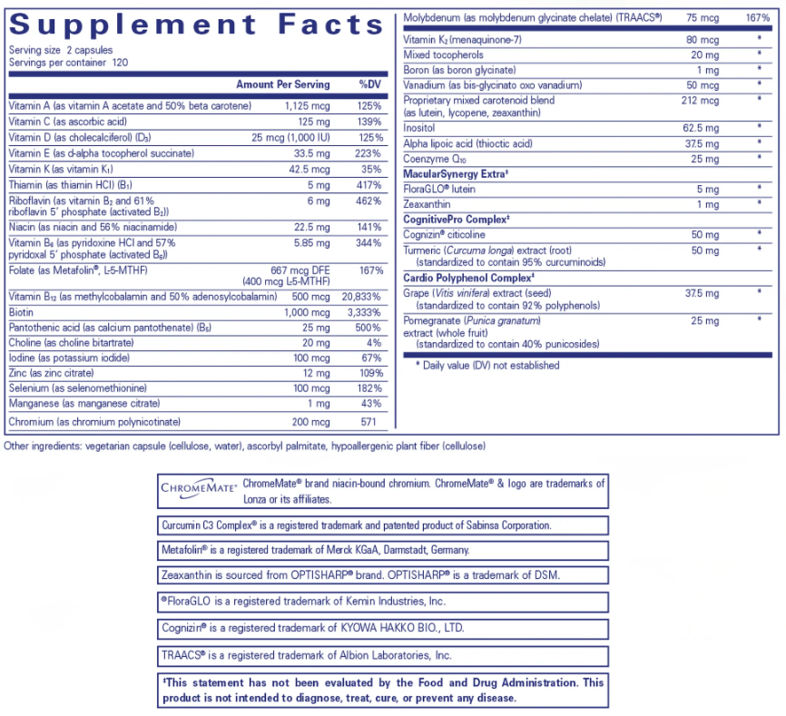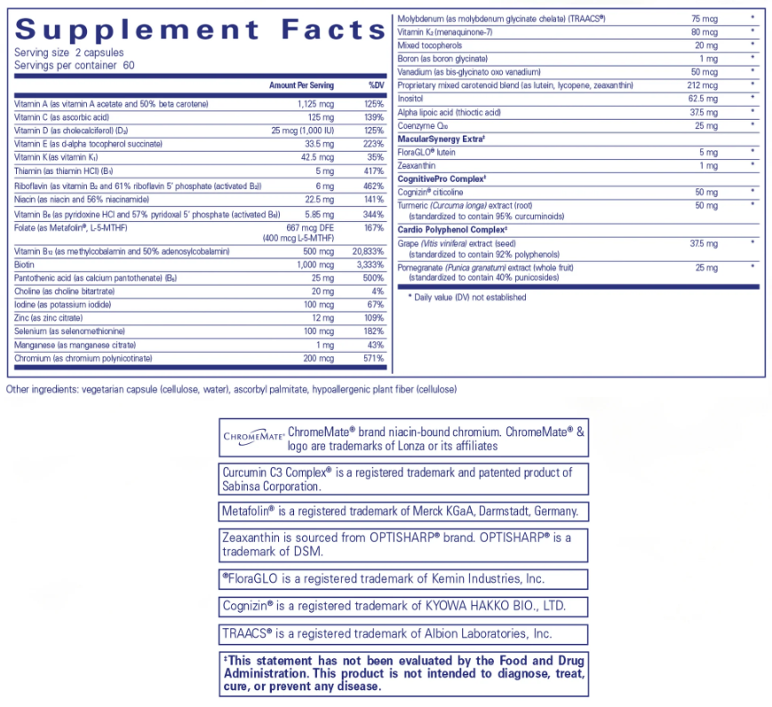 Antioxidant Support: Features antioxidants like alpha-lipoic acid, CoQ10, grape seed extract, pomegranate extract, lutein, and zeaxanthin to combat oxidative stress and support cellular health.