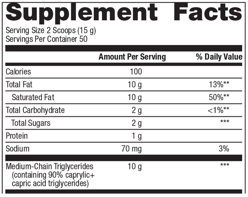 Take 2 scoops (15 g) of MCT Powder 2-3 times per day or as recommended by your healthcare practitioner.