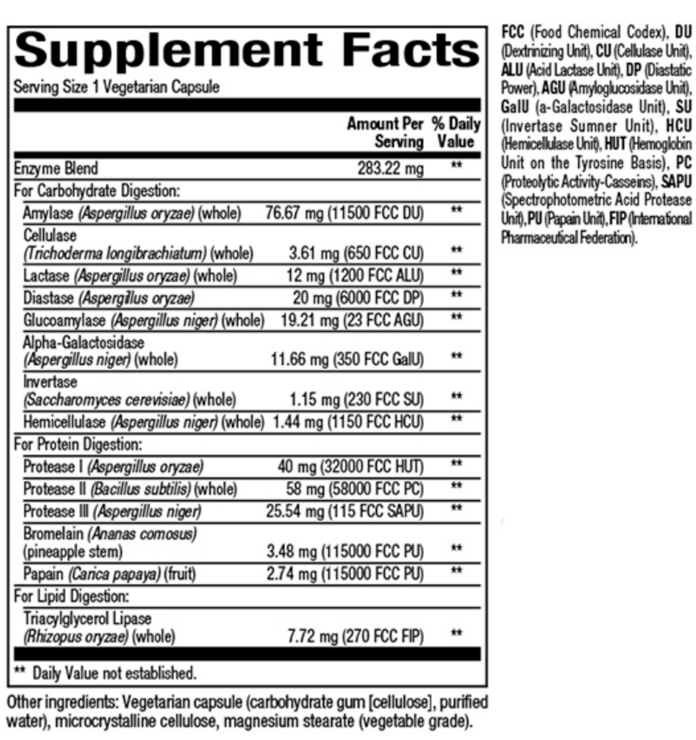Includes a broad spectrum of vegetarian enzyme activities such as protease, amylase, lipase, cellulase, and more to support digestion of different macronutrients.