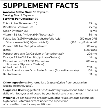 Neuropath-ease contains several B vitamins along with other key nutrients to help aid nerve cell transmission and reduce the symptoms of peripheral neuropathy.