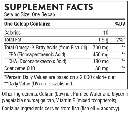 Omega-3 w/ CoQ10 is a high-efficiency formula combining heart-healthy omega-3 fatty acids (EPA/DHA) with coenzyme Q10 to support cellular energy and cardiovascular wellness.