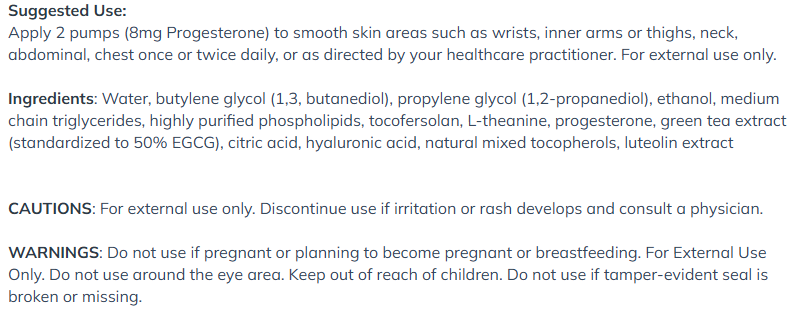 Peace Progesterone is a topical serum providing 8 mg of bioidentical progesterone per 2 pumps. Derived from the plant sterol diosgenin, Peace Progesterone is delivered using Quicksilver Scientific’s proprietary lipid nanoemulsion technology for enhanced absorption of ingredients.