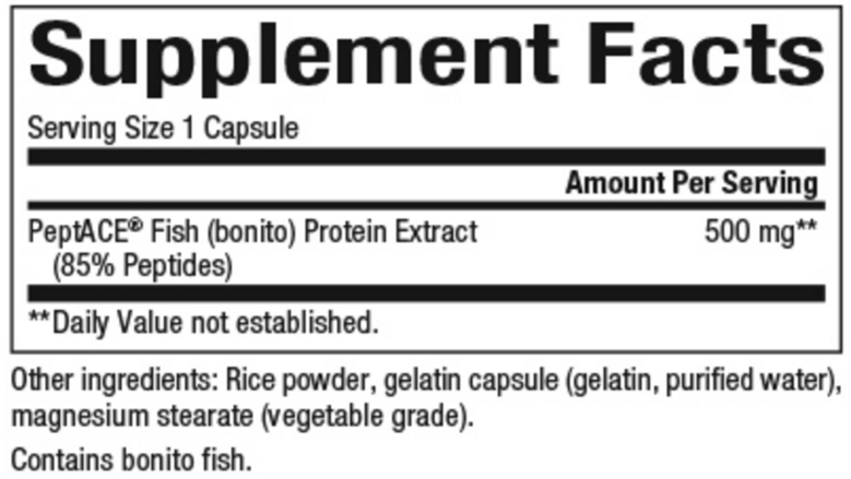 PeptACE® Fish Peptides 500 mg is a concentrated supplement containing a blend of small peptides derived from bonito fish, designed to support healthy blood pressure and cardiovascular wellness.