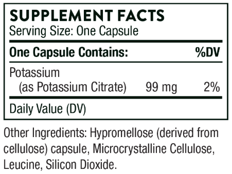 Thorne Potassium Citrate is a dietary supplement formulated with potassium citrate in capsule form. Each bottle contains 90 capsules and is free from gluten, dairy, and soy.
