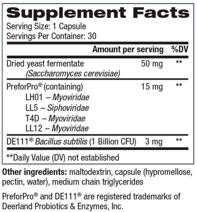 Combines a patented prebiotic (PreforPro®), a spore-based probiotic strain (Bacillus subtilis DE111®), and beneficial yeast fermentate to deliver multi-level gut support