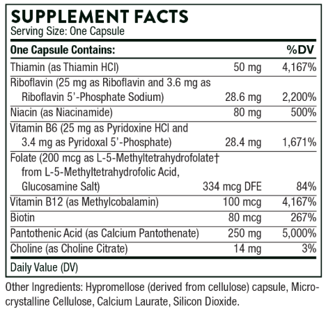 Thorne Stress B-Complex supplies a balanced mix of B vitamins, including thiamine, riboflavin, niacin, vitamin B6, folate, vitamin B12, biotin, and pantothenic acid. Each batch is manufactured and tested for quality. Free of gluten, dairy, and soy.