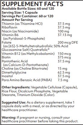 • This unique, high quality formula contains the most biologically active forms of many B-vitamins including B12 in the form of methylcobalamin. B-vitamins play many important roles in the body. For example, vitamin B12 and folic acid (Quatrefolic®) are crucial for proper cell division; vitamins B1, B2, B3 and biotin are essential for energy production. Amino acid metabolism requires vitamin B6. Vitamin B5 is necessary for the synthesis of acetylcholine (a neurotransmitter) and is also involved with energy production. Some B vitamins have been shown to play a role in wound healing and vitiligo. Biotin is known to improve nail strength.