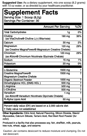 Super Creatine is a pre-workout energy drink designed to support endurance, cardiovascular output, oxygen utilization, and muscle strength and recovery. This drink powder combines ingredients that provide a surplus of powerful energy in preparation for intense exercise while avoiding the common “sugar crash” halfway through a workout. With the reduced dependency on elevated blood glucose, and a ready and sustainable supply of “instant energy” from creatine magnesium chelate, DMG, amino acids, and beetroot powder, you should experience greater stamina, endurance and faster recovery.*