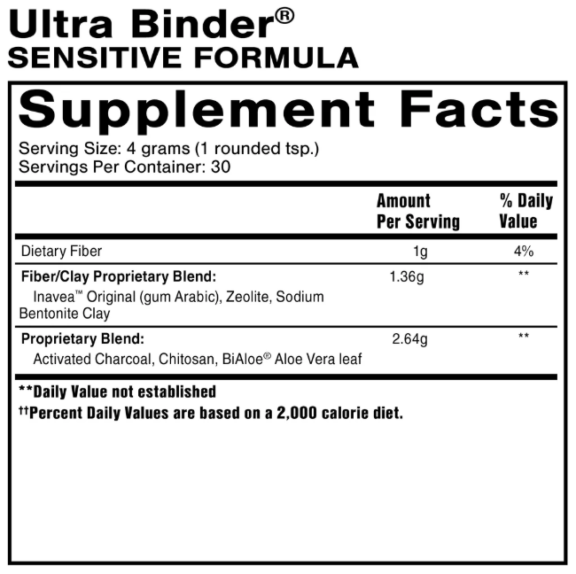 Ultra Binder® Sensitive by Quicksilver Scientific is a gentle detoxification supplement designed to support the body's natural ability to remove environmental toxins. This low-sulfur formula combines zeolite, bentonite clay, activated charcoal, and chitosan to bind to a wide array of toxins, including heavy metals, pesticides, herbicides, hormone mimics, food additives, mold, and microbial toxins. Enhanced with acacia gum and aloe vera, it also helps soothe the gastrointestinal tract. Suitable for individuals with sensitivities, this product offers a milder alternative to the standard Ultra Binder®.