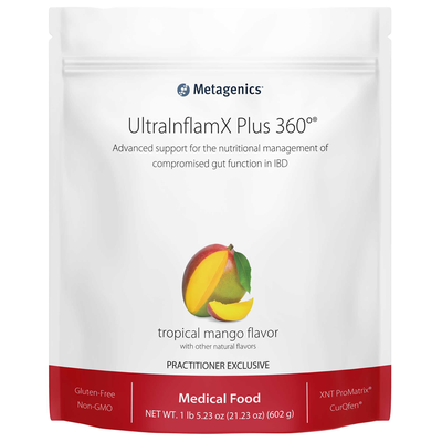 UltraInflamXPlus 360°® is a medical food formulated to provide strategic macro- and micronutrient support for patients with compromised gut function resulting from inflammatory bowel disease, including ulcerative colitis and Crohn’s disease. Provided in a proprietary, vegan pea/rice protein base, this formula addresses increased nutrient needs and potential deficiencies in these patients. This formula features CurQfen®, a clinically studied, patented curcumin blend designed for greater bioavailability and more reliable clinical outcomes. It has been demonstrated to result in up to 45.5 times more free curcuminoids in human plasma compared to standard curcumin extract. UltraInflamX Plus 360° also features XNT ProMatrix®– a proprietary protein matrix technology designed to enhance the delivery of a high quality xanthohumol compound for increased bioavailability and stability.