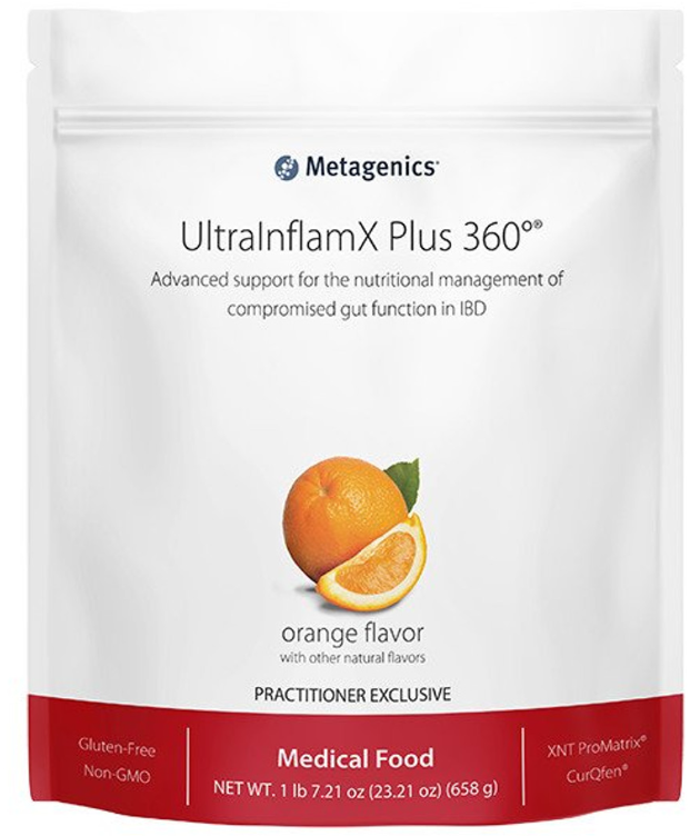 UltraInflamXPlus 360°® is a medical food formulated to provide strategic macro- and micronutrient support for patients with compromised gut function resulting from inflammatory bowel disease, including ulcerative colitis and Crohn’s disease. Provided in a proprietary, vegan pea/rice protein base, this formula addresses increased nutrient needs and potential deficiencies in these patients. This formula features CurQfen®, a clinically studied, patented curcumin blend designed for greater bioavailability and more reliable clinical outcomes. It has been demonstrated to result in up to 45.5 times more free curcuminoids in human plasma compared to standard curcumin extract. UltraInflamX Plus 360° also features XNT ProMatrix®– a proprietary protein matrix technology designed to enhance the delivery of a high quality xanthohumol compound for increased bioavailability and stability.