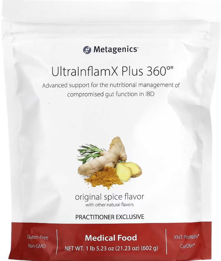 UltraInflamXPlus 360°® is a medical food formulated to provide strategic macro- and micronutrient support for patients with compromised gut function resulting from inflammatory bowel disease, including ulcerative colitis and Crohn’s disease. Provided in a proprietary, vegan pea/rice protein base, this formula addresses increased nutrient needs and potential deficiencies in these patients. This formula features CurQfen®, a clinically studied, patented curcumin blend designed for greater bioavailability and more reliable clinical outcomes. It has been demonstrated to result in up to 45.5 times more free curcuminoids in human plasma compared to standard curcumin extract. UltraInflamX Plus 360° also features XNT ProMatrix®– a proprietary protein matrix technology designed to enhance the delivery of a high quality xanthohumol compound for increased bioavailability and stability.