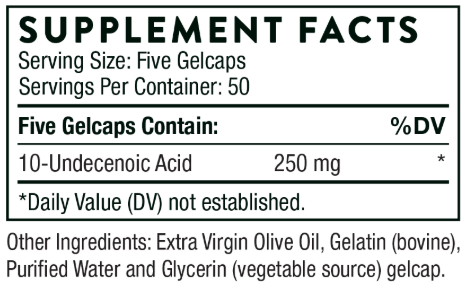 Thorne Formula SF722 is a dietary supplement formulated with undecylenic acid, a fatty acid known for its potential to support a healthy balance of gastrointestinal and vaginal flora. Each bottle contains 250 gelcaps and is free from gluten, dairy, and soy.