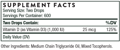 Thorne Vitamin D Liquid provides 1,000 IU of vitamin D per drop. The formula comes in a convenient liquid form for easy dosing. Each bottle contains 1 fl. oz (30 mL) of product and is free from gluten, dairy, and soy.